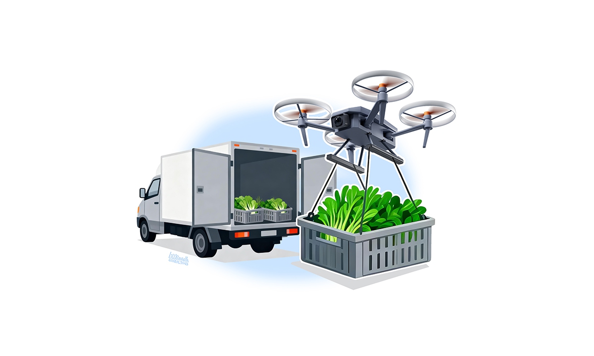 Innovaciones logísticas, como el uso de drones para transportar verduras, mejoran la llegada de alimentos frescos a mercados urbanos en China.
